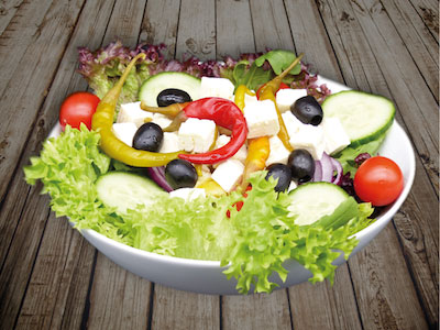 Gemischter Salat mit Hirtenkäse, Oliven>, scharfe Peperoni