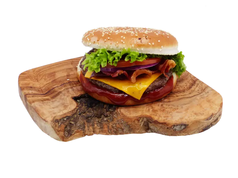 125g Angus-Rindfleisch, Tomaten, Zwiebeln, Salat, BBQ-Sauce, Bacon (Hähnchen), Käse
