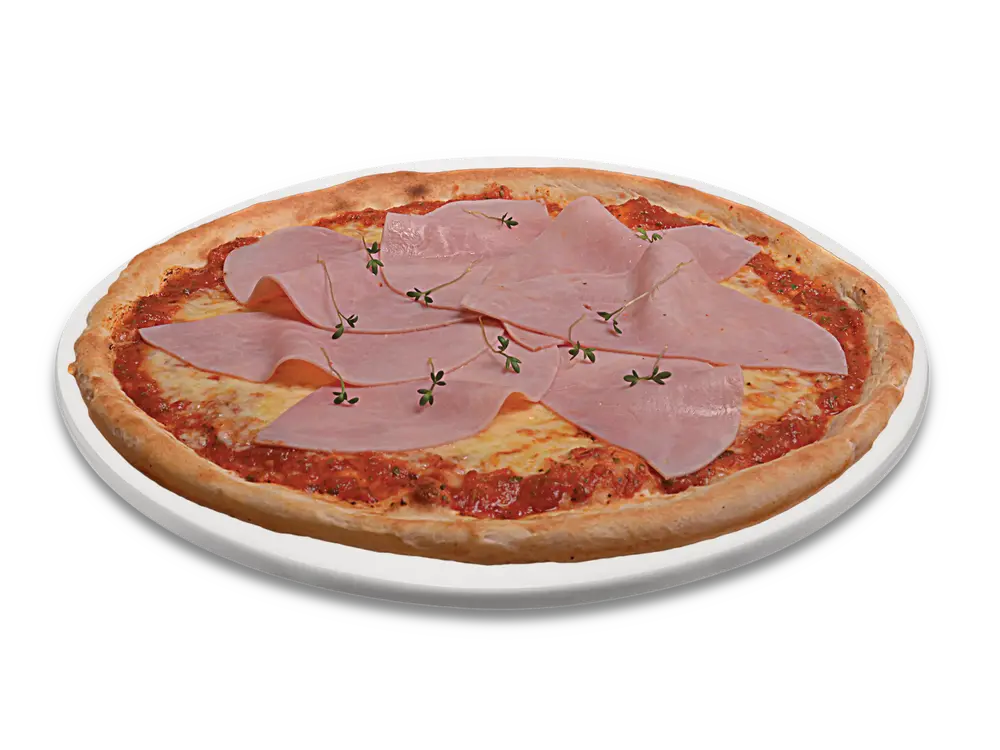 Frischer Teig, Tomatensauce, echter Käse, Kochschinken (Pute)