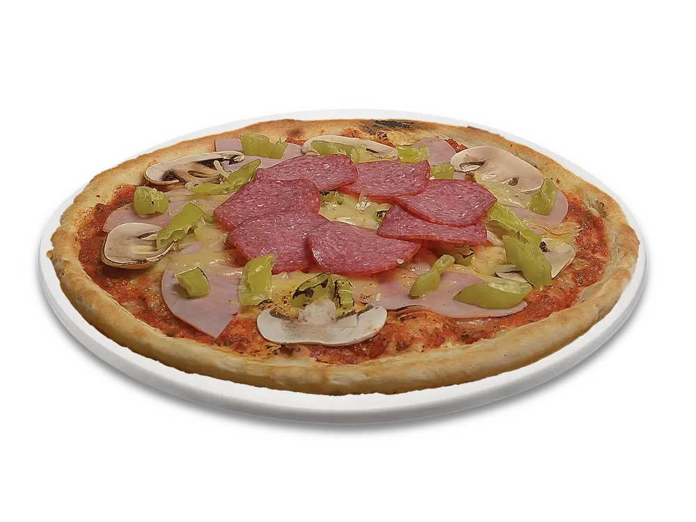 Frischer Teig, Tomatensauce, echter Käse, Kochschinken(Pute), Salami(Pute), frische Champignons, Peperoni